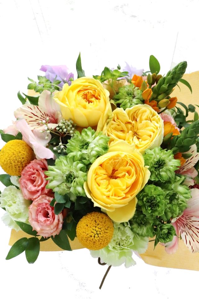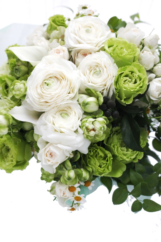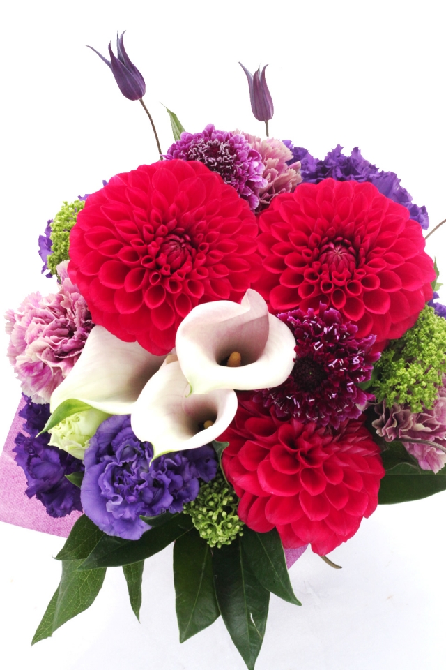 | 写真の使用花材 | 【写真左】 バラ、カーネーション、スカビオサ、アスチルベ 【写真中】 カラー、チューリップ、ラナンキュラス、カーネーション 【写真右】 チューリップ、カーネーション、ネリネ、ラナンキュラス |