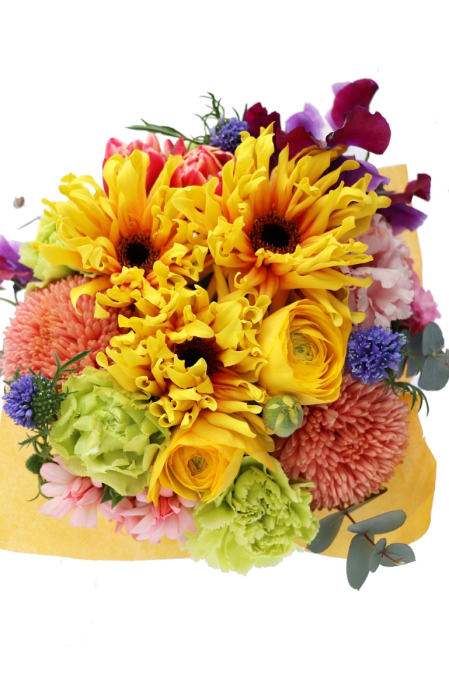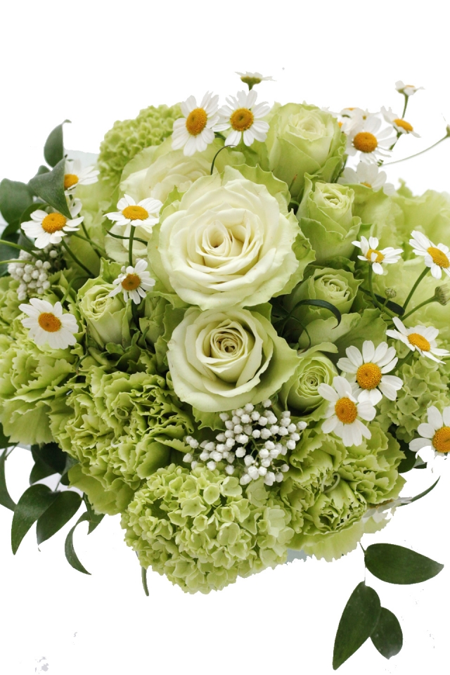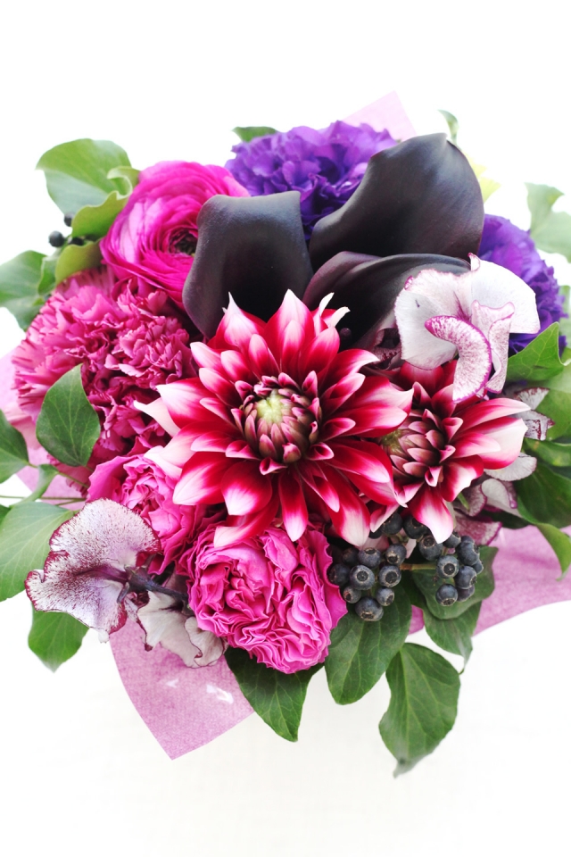 | 写真の使用花材 | 【写真左】 バラ、カーネーション、シンビジウム 【写真中】 バラ、アジサイ、ネリネ、青リンゴ 【写真右】 アマリリス、コチア、ペッパーベリー |