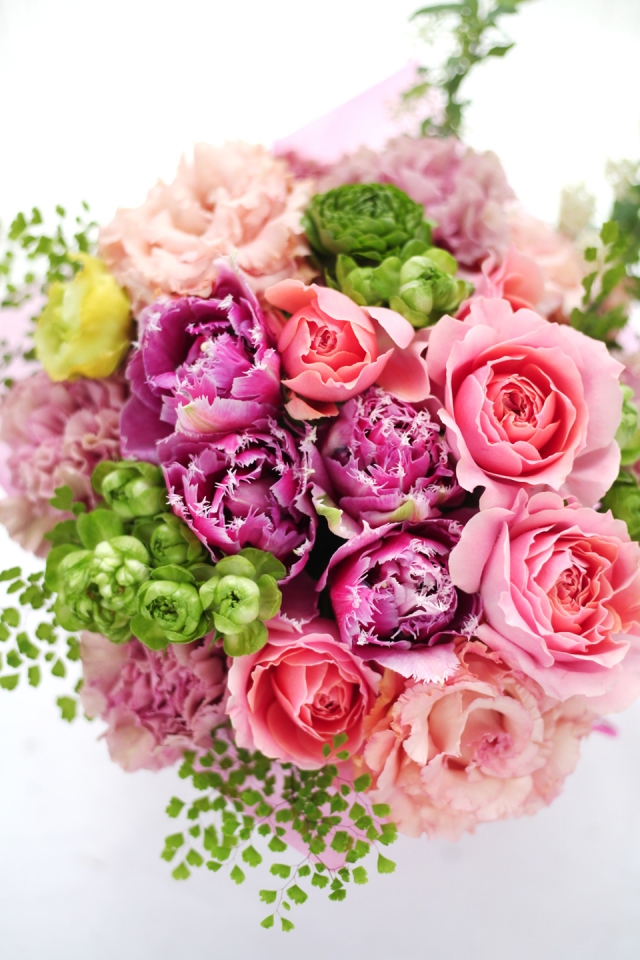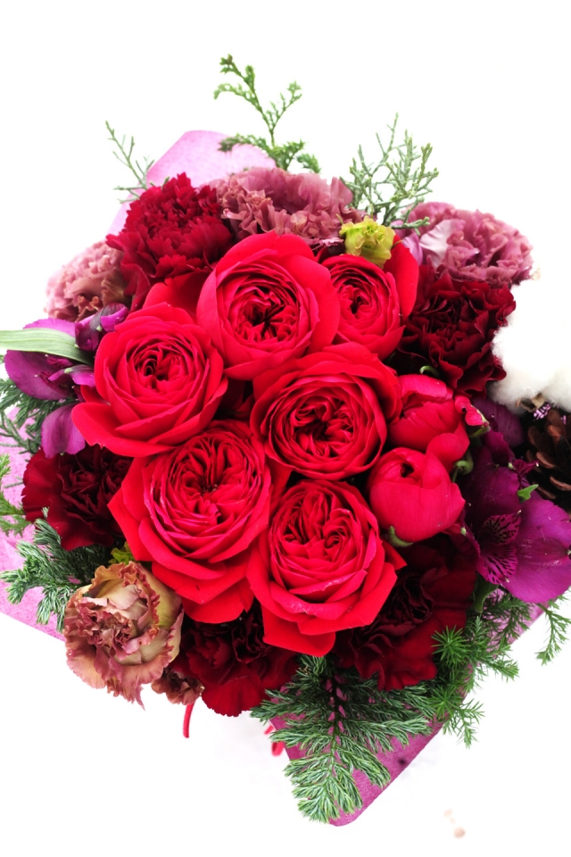 | 写真の使用花材 | 【写真左】 アマリリス、カラー、アジサイ、青リンゴ 【写真中】 バラ、ラナンキュラス、ガーベラ 【写真右】 アマリリス、チューリップ、ヒヤシンス |