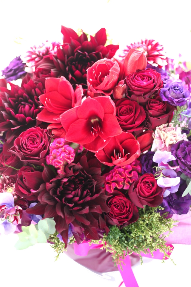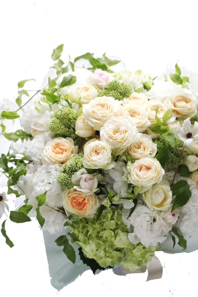 | 写真の使用花材 | 【写真左】 バラ、アジサイ、トルコキキョウ、カーネーション 【写真中】 バラ、アジサイ、カーネーション、シャクヤク、ヒヤシンス 【写真右】 バラ、スプレーバラ、カーネーション、アジサイ |