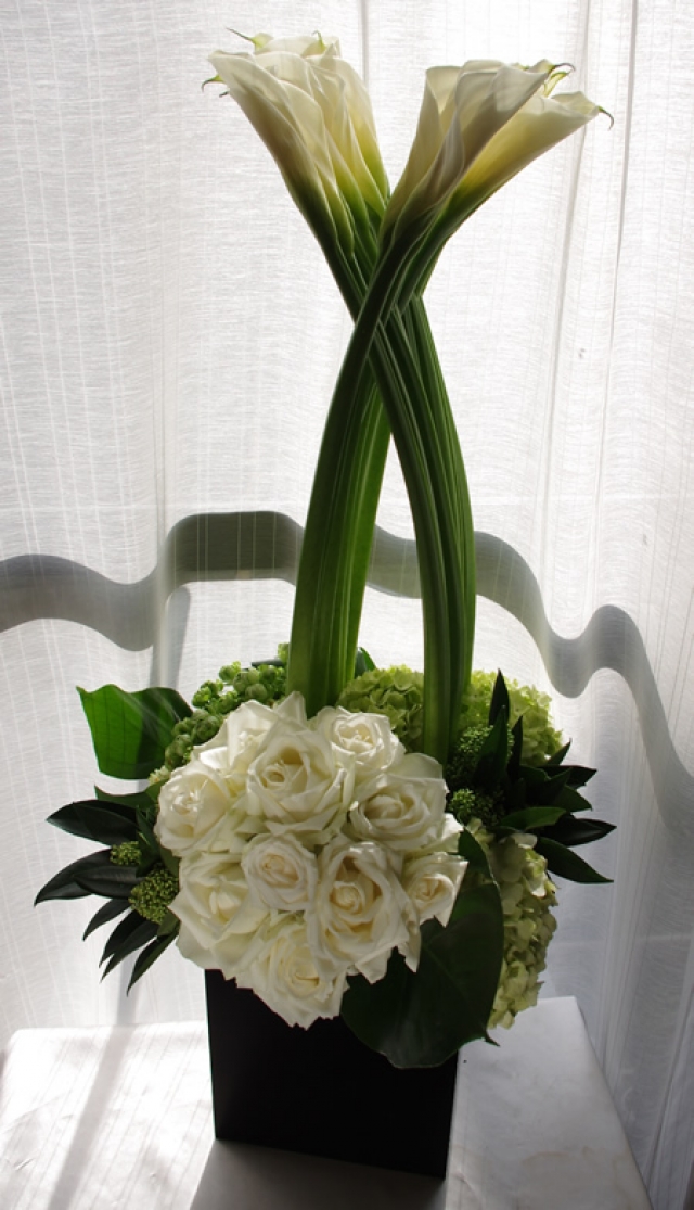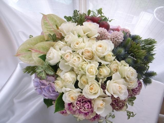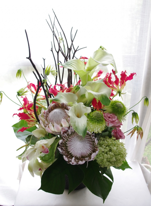 | 写真の使用花材 | 【写真左】 バラ、アジサイ、カーネーション、アンスリューム 【写真中】 キングプロテア、カラー、グロリオサ、シンビジウム 【写真右】 カラー、バラ、アジサイ、シキミアグリーン |