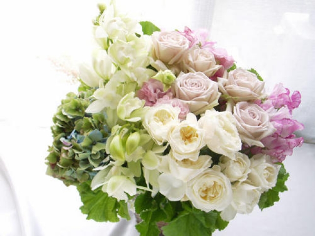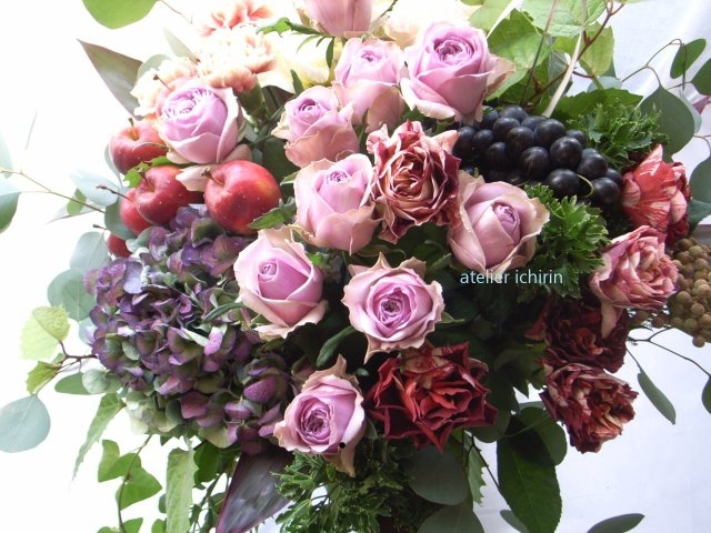 | 写真の使用花材 | 【写真左】 バラ、スプレーバラ、アルストロメリア、ビバーナム 【写真中】 バラ2種、アジサイ、ブドウ、スプレーバラ、トルコキキョウ 【写真右】 バラ、シンビジウム、アジサイ、スィートピー |