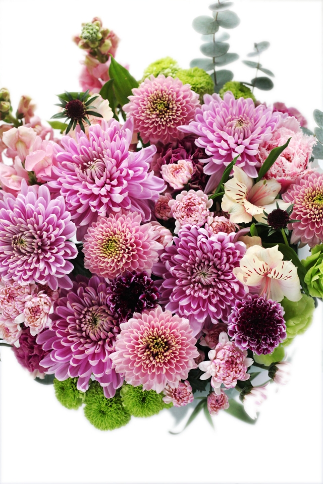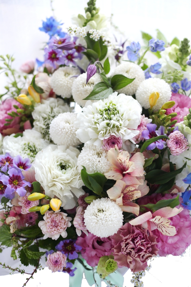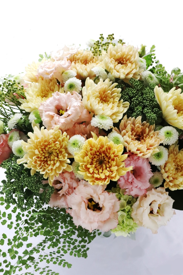 | 写真の使用花材 | 【写真左】 アジサイ、シンビジウム、マム、アルストロメリア 【写真中】 アナスタシア、スプレーバム、アジサイ、シンビジウム 【写真右】 アマリリス、チューリップ、アジサイ、スィートピー |