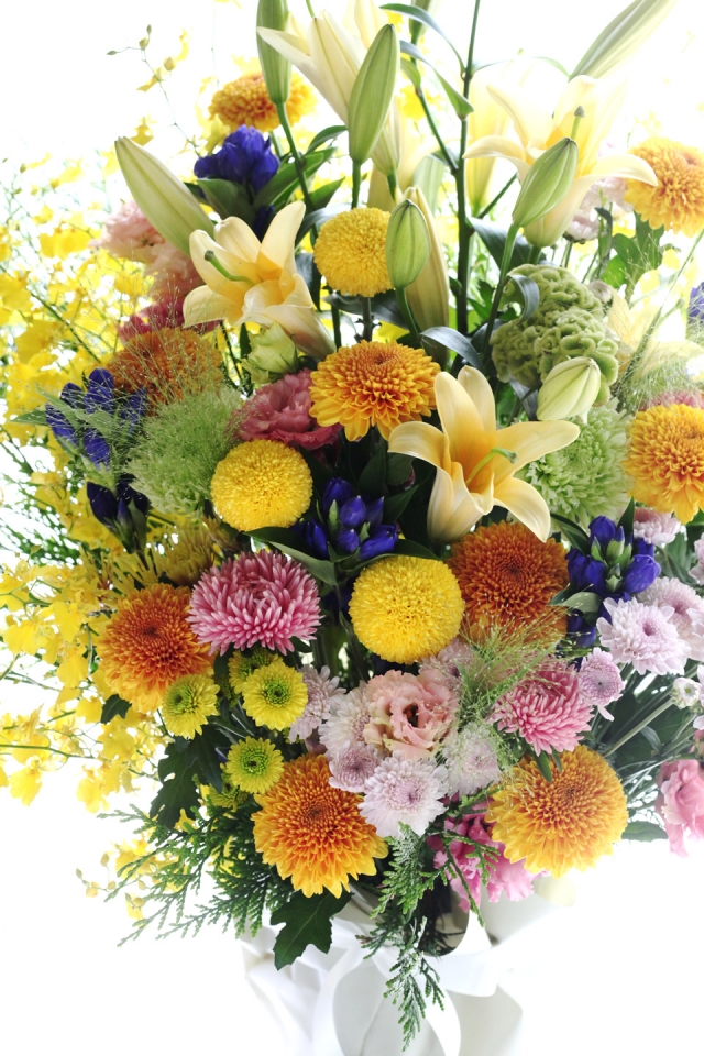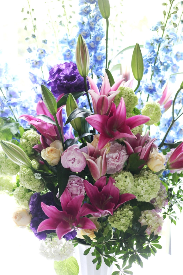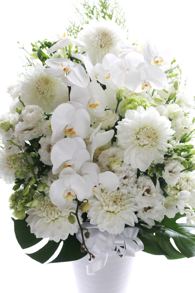 | 写真の使用花材 | 【写真左】 ユリ、シンビジウム、トルコキキョウ、アンスリューム、アジサイ 【写真中】 ユリ、シンビジウム、アジサイ、カーネーション、ピンポンマム 【写真右】 アマリリス、マム、アジサイ、アナスタシア、デンファレ |